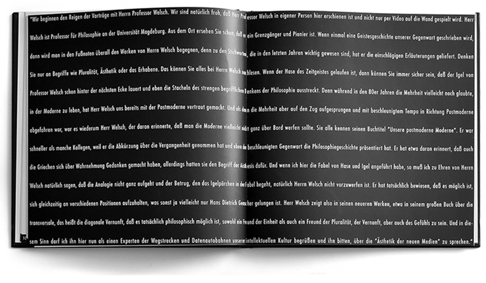 Im Zuge meiner Festanstellung gestaltete ich diese 76seitige Selbstdarstellung der Agentur. Deren Grundlage war eine Vortragsreihe zu Themen aus Kunst, Kommunikation und Wissenschaft, die die Agentur anlässlich ihres Umzugs in das schöne alte Katasteramt der Stadt Düsseldorf für Mitarbeiter, Freunde und Kunden veranstaltet hat. Die Projekte auf den hier abgebildeten Seiten wurden von mir als Art Directorin begleitet.